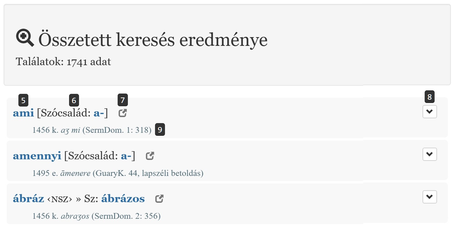 A találati lista elemei tartalmazzák a címszót 5, és szükség esetén a találat helyének pontosabb meghatározását is 6, valamint adatok és etimológiák esetében a megtalált szótári egységet 9. Ha a keresett elem szócikk, akkor a listában csak a címszó látható, de többféle lehetőség van a teljes szócikk megjelenítésére is. Minden egyes találat mellett megjelenik egy ikon 7, amelyre kattintva a teljes szócikk megnyitható egy új böngészőablakban. Továbbá minden egyes találat kinyitható és becsukható a sor jobb szélén megjelenő lefelé, ill. felfelé mutató nyíl gombbal 8 vagy a találatot befoglaló szürke téglalap tetszőleges részén dupla kattintással. Kinyitás után a teljes szócikk láthatóvá válik közvetlenül a találati listában, a keresett elem pedig sárga kiemelést kap a szócikken belül. Technikai okokból a találati lista szakaszosan jelenik meg, az oldal aljára görgetve mindig automatikusan töltődnek be a további találatok.