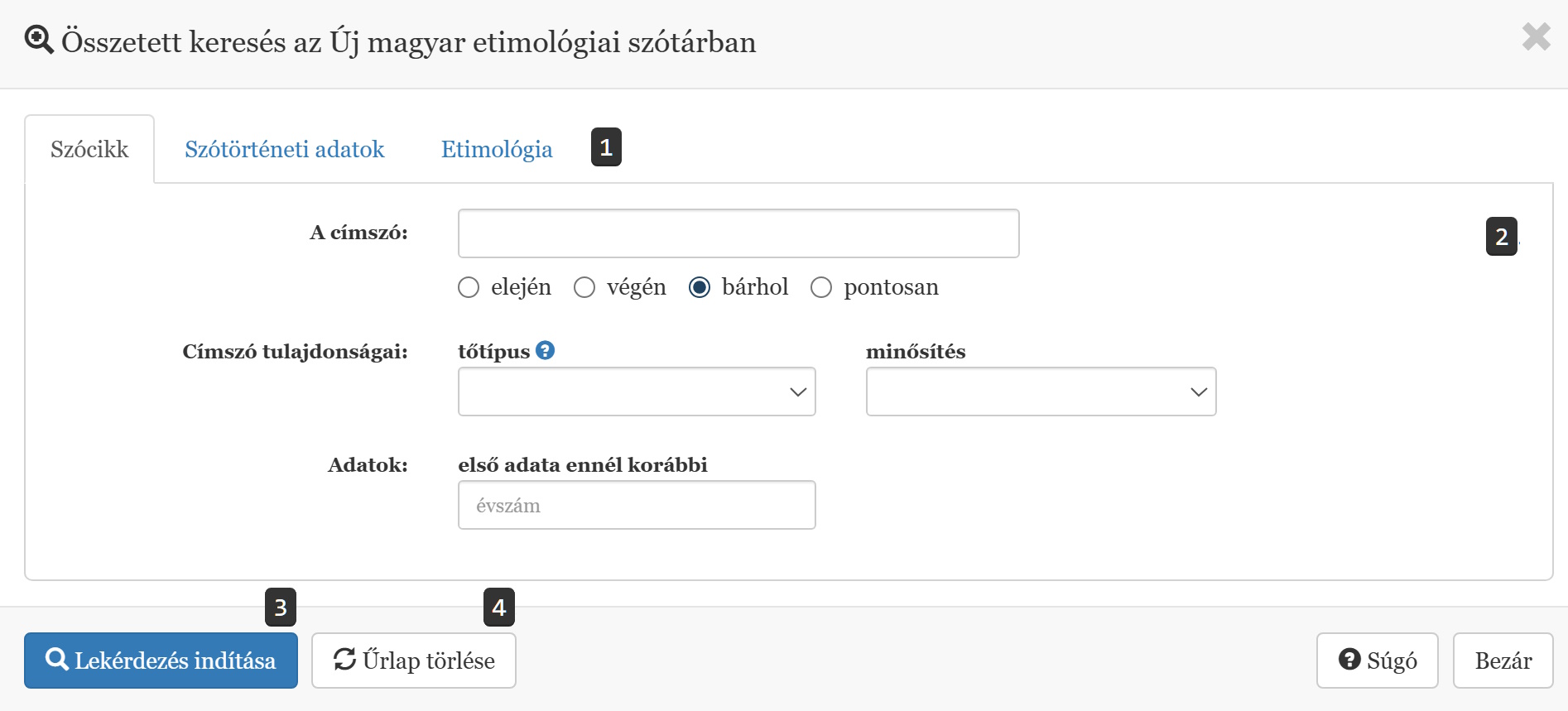 Az összetett keresés első lépéseként mindig azt kell eldöntenünk, hogy milyen típusú szótári elemeket vizsgáljunk 1. Lehetőség van teljes szócikkek, egyes szótörténeti adatok és az etimológiák különféle szempontok szerinti kigyűjtésére is. Az említett szótári egységek mindegyikéhez külön lap tartozik a keresőfelületen. A megfelelő lap kiválasztása után az adott elemhez tartozó szűrőfeltételek jelennek meg az ablakban 2. A kereséshez legalább egy feltétel megadása szükséges, de a szűrőfeltételek tetszőleges számban szabadon kombinálhatók is egymással. A lekérdezés elindításához kattintsunk a Lekérdezés elindítása gombra 3. A keresés után a korábban megadott szűrőfeltételek megőrződnek (amíg ugyanabban a böngészőablakban maradunk). Szükség esetén az űrlap összes mezőjét egyszerre törölhetjük az 'Űrlap törlése' gomb segítségével 4.