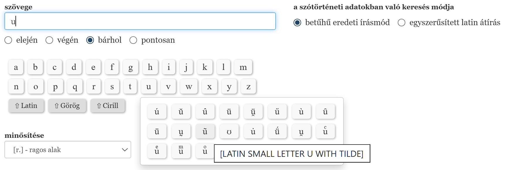 Ha a betűhű eredeti írásmódot választjuk, a beírómező alatt virtuális billentyűzet jelenik meg, melynek segítségével a szótárban előforduló összes speciális karaktert be tudjuk vinni. Ebben az esetben a rendszer kizárólag a keresőkifejezésnek tökéletesen megfelelő adatokat fogja megtalálni. A virtuális billentyűzeten bármelyik alapbetűre kattintva megjelenik annak összes speciális, ill. ékezetes változata, miközben az alapbetű megjelenik a beírómezőben is. Ha bármelyik speciális változatra kattintunk, a beírómezőben az alapbetű erre a karakterre változik. Ha az egérmutatót hosszabban valamelyik karakter fölött tartjuk, megjelenik annak pontos Unicode szerinti megnevezése.